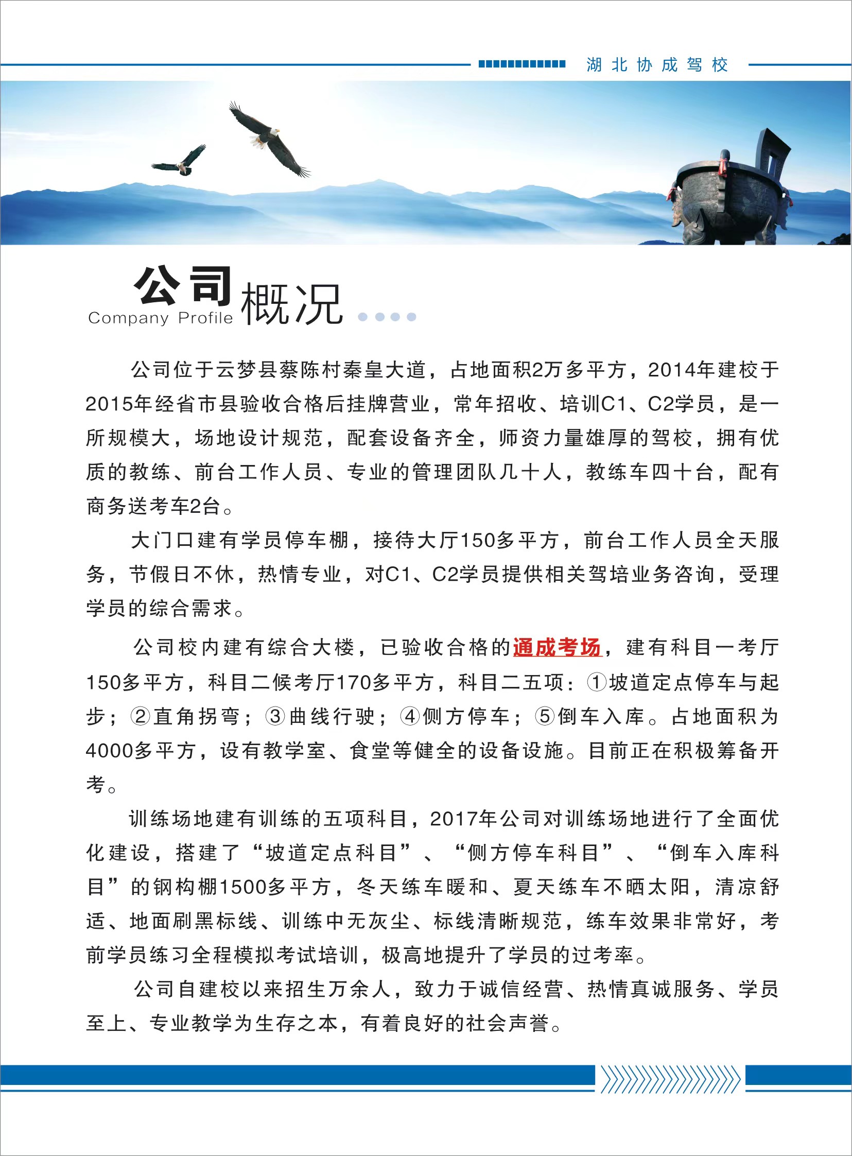 公司总占地面积22680平方米,拥有教练员40余名,教练车40辆,是一家场地规划大,设施齐全,管理规范,师资力量雄厚,培训过考率高的驾校。拥有各型性能良好的车辆提供教学,教练员是通过严格的考核,并持证上岗,属经验丰富、作风正派、有职业道德、责任心强的高级驾驶员执教。真实模拟实际路况,在这里可以学到真实的驾驶技术。为每一位学员提供优质教学。